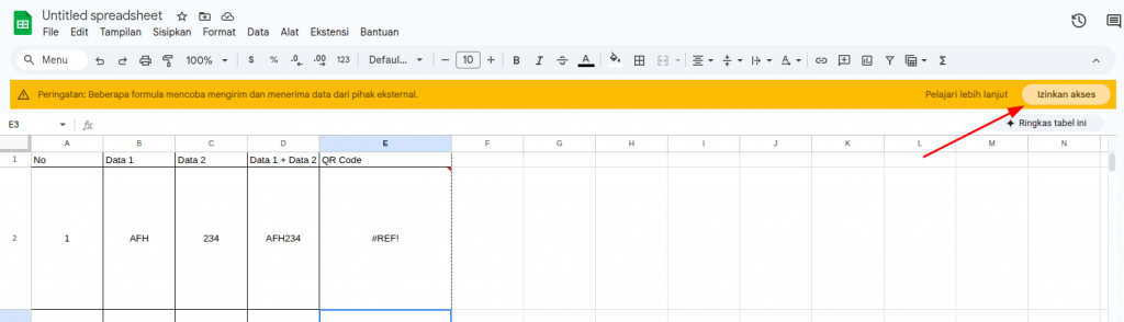 Setelah Formula diletakan biasanya Sheet akan meminta ijin untuk mengirim dan menerima data dari pihak external, SIlakan berikan Ijin dan proses generate akan dimulai dan secara otomatis akan menghasilkan sebuah gambar QR-code sesuai dengan nilai dari field yang ditunjuk dalam hal ini D2