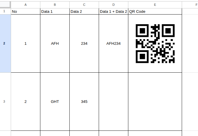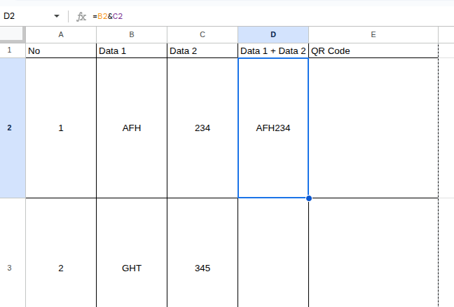 Pada contoh ini kita akan generate QR code yang datanya merupakan gabungan dari nilai “Data 1” dan “Data 2”, untuk menggabungkan nilainya cukup dengan menggunakan rumus “&”