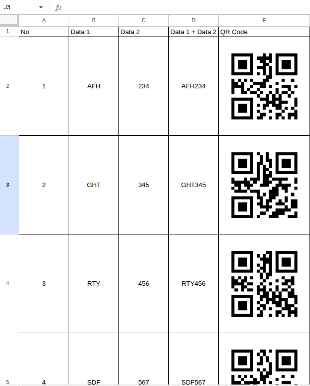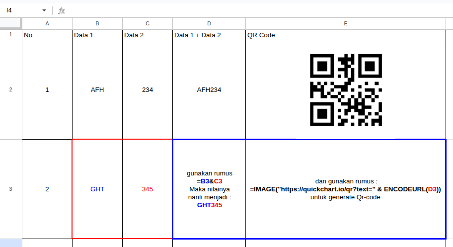 Setelah data terbuat (Gabungan “Data 1” dan “Data 2”) kita bisa gunakan nilainya untuk menjaid nilai dari QR-Code yang akan di generate gambarnya menggunakan rumus berikut :