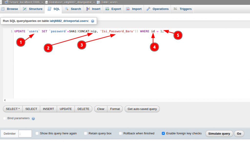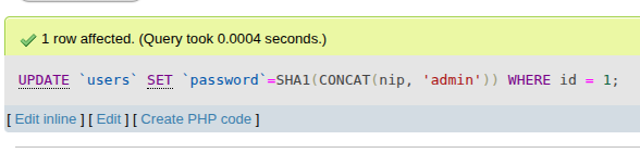 UPDATE `users` SET `password`=SHA1(CONCAT(nip, 'Isi_Password_Baru')) WHERE id = 1;