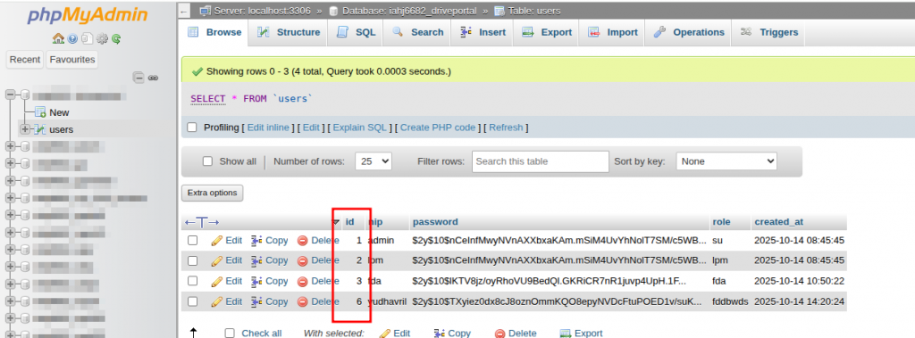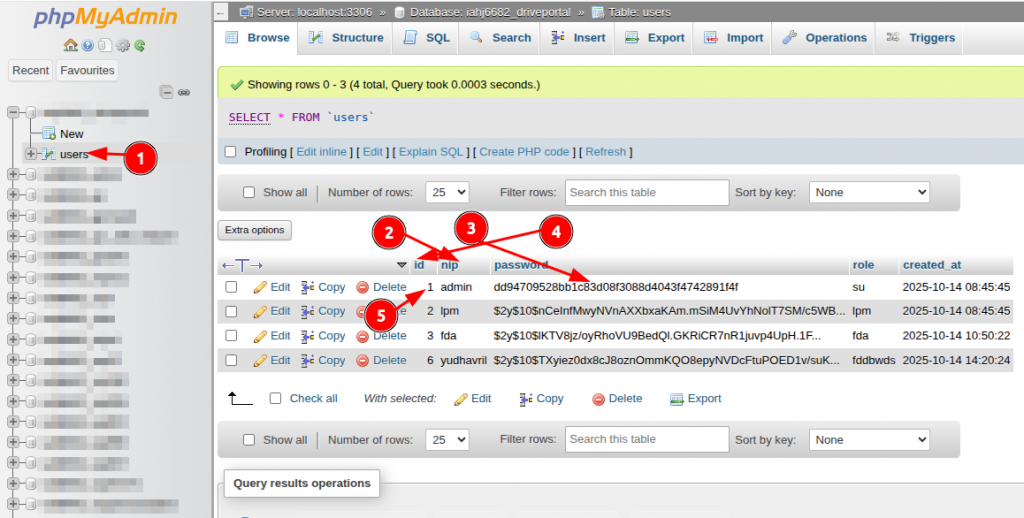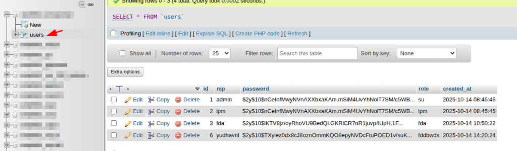 - Lihat informasi user_id untuk user yang ingin direset. Misal user_id / id administratornya adalah 1.