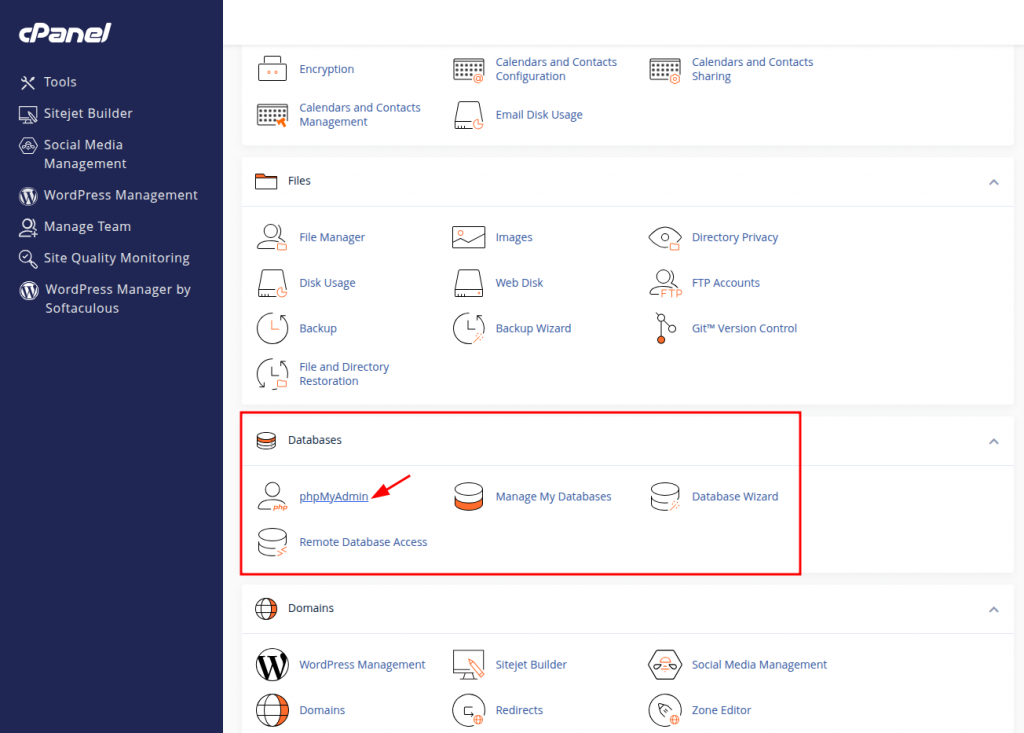 - Melalui Cpanel, masuk ke database melalui menu Databases > phpMyAdmin