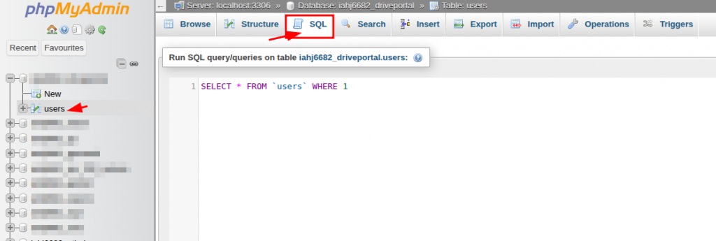 - Setelah mengetahui informasi user_id / id administratornya, langkah selanjutnya adalan menjalankan query database. Anda bisa klik menu SQL yang ada diatas table.